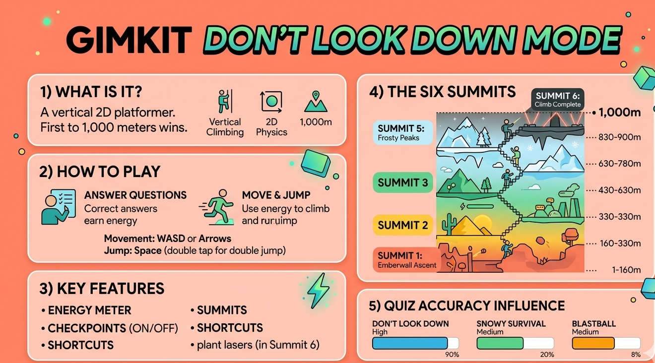 Gimkit Don’t Look Down launched in October 2023 as the platform’s first 2D platformer game mode. Players climb a vertical obstacle course by answering quiz questions — correct answers earn the energy needed to move and jump. The first player to reach 1,000 meters wins. This guide covers how the mode works, host settings, strategies, and how to use it in class.