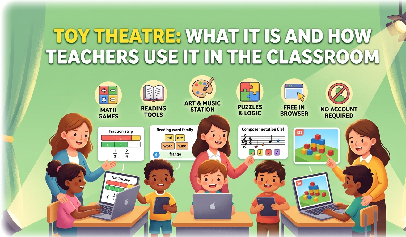 Toy Theatre is a free browser-based platform with educational games for kindergarten through sixth grade. Founded in 2001 by Joel Gaspard, it now draws over one million users annually. Teachers use it without accounts, downloads, or subscriptions — though a paid tier exists for classroom management features.